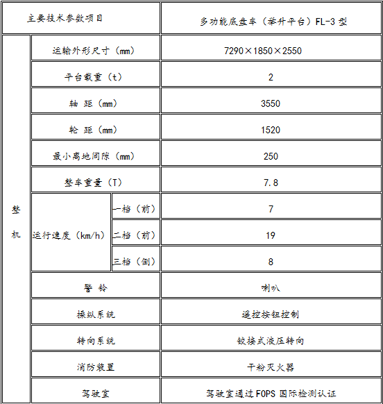 多功能底盤車(舉升平臺)FL-3型主要針對非煤礦山井下高空作業(yè)專門研發(fā)生產(chǎn)的。采用了專用的底盤結構設計、高強度的結構材料、先進的加工制作工藝技術及可變換的工作裝置。安全實用、穩(wěn)定可靠、經(jīng)濟運行等功效特征顯著。整車具有耐碰撞性高、油耗低、綜合運行成本底、操作簡單、乘坐舒適、結構合理、維修保養(yǎng)容易等優(yōu)點。